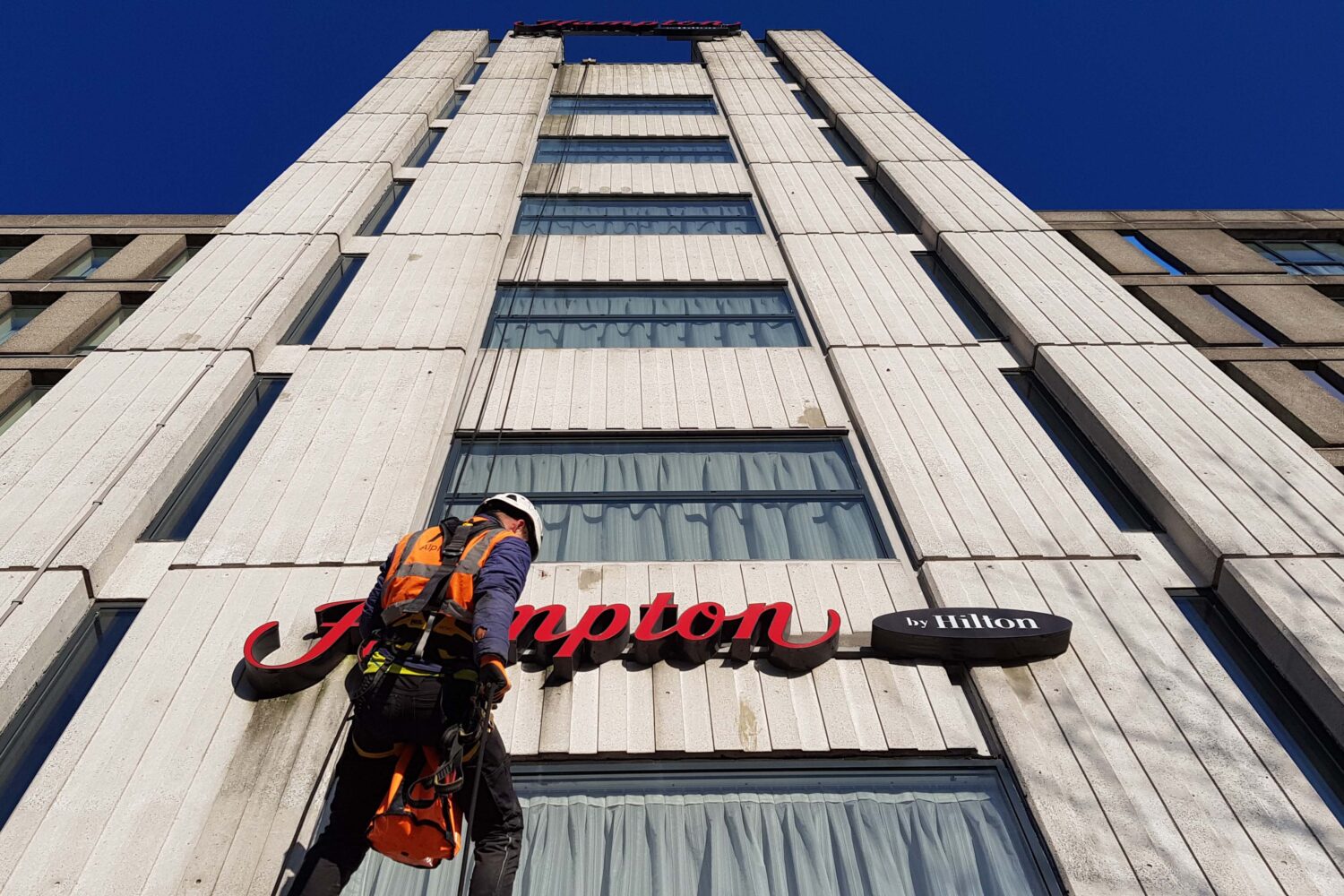 Signage and banners are usually installed high above the public. It makes sense. They need to be visible. This makes industrial abseiling a perfect access solution for their installation. The rope access method eliminates the need for costly scaffolding and helps in situations where a MEWP can’t be used. After carefully planning, we will turn up on site, deploy our rope system, safely carry out the installation process and clear the site - very often unnoticed by the public.